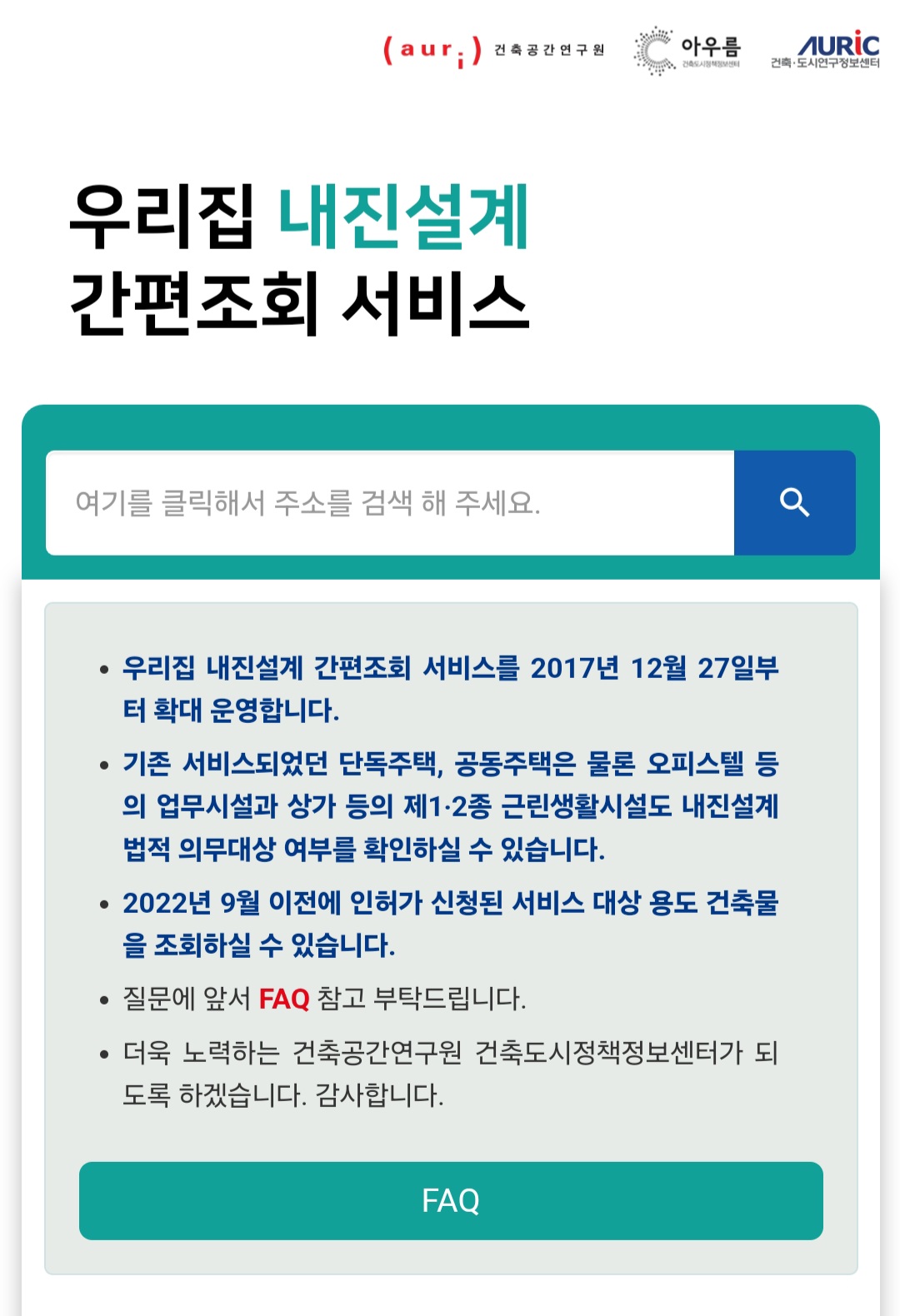 그렇다면 우리 아파트 내진설계는 어떻게 확인하는가? 바로 아우름이라는 건축ㆍ도시연구 정보센터에서 우리집 내진설계 간편조회 서비스를 제공하고 있습니다.
