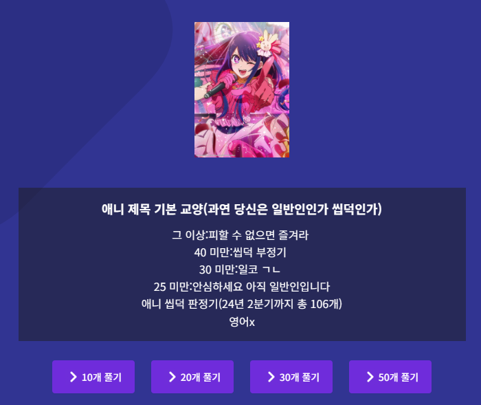 예를 들기 위해 애니 제목 기본 교양이라는 퀴즈를 풀어봤는데요. 25개 미만이라 아직 일반인이라고 하니 정말 다행입니다.