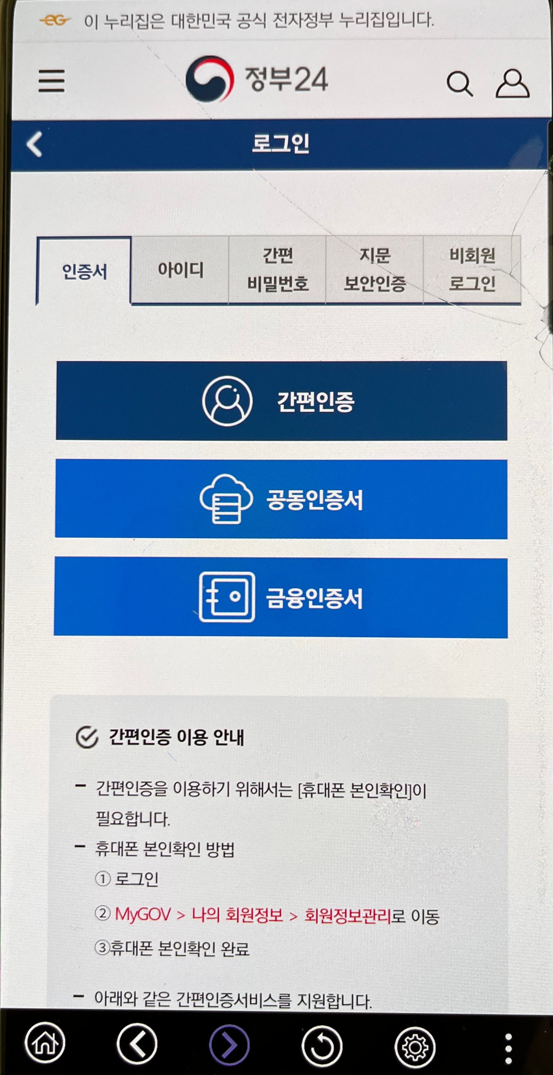 금융인증서나 공동인증서가 있으시면 그걸로 로그인하셔도 됩니다만 저는 간편인증으로 간단하게 카카오톡으로 인증했습니다.