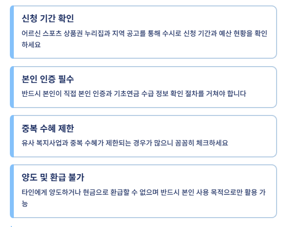 신청 기간과 예산 현황은 수시로 어르신 스포츠 상품권 누리집과 지역 공고를 통해 확인하세요. 신청은 반드시 본인이 직접 본인 인증과 기초연금 수급 정보 확인 절차를 거쳐야 하며 중복 수혜가 제한되는 경우가 많으니 꼼꼼히 체크해야 합니다.