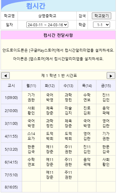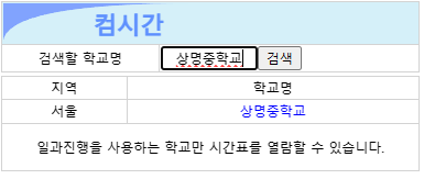 예를 들어, 상명중학교를 검색할 경우 일정 기간의 학급별 시간표 조회가 아래와 같이 이루어집니다.