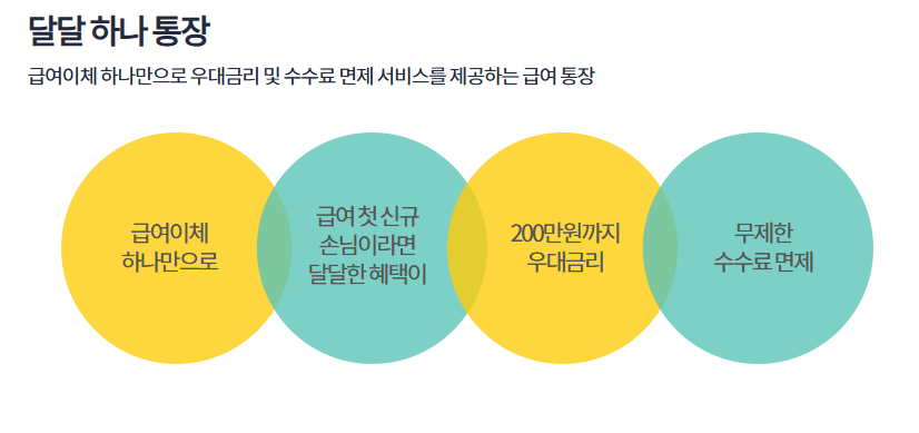 - 급여이체 실적이 있다면 달달하나통장으로 월급통장+파킹통장 효과를 동시에 누릴 수 있습니다.