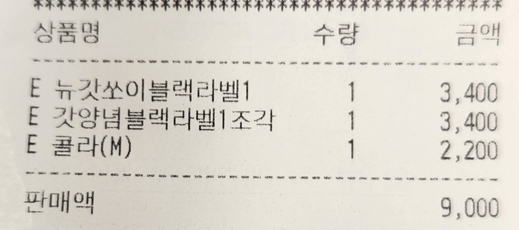KFC 키오스크에서는 애플페이, 페이코, 카카오페이, 제로페이, 신용카드 등의 결제수단이 사용가능함을 확인할 수 있었지만 휴대폰만 덜렁 들고온 저는 직원을 불러 현금 결제를 했습니다. 뉴갓쏘이블랙라벨 1조각 3,400원, 갓양념블랙라벨 1조각 3,400원, 콜라 미디움 2,200원으로 총 9,000원이 결제되었네요.
